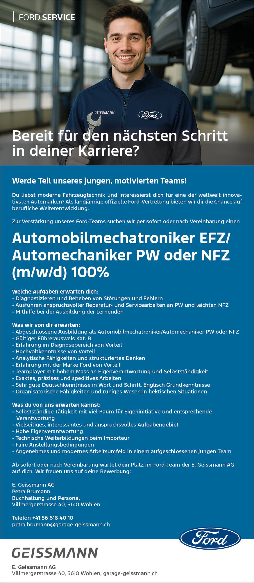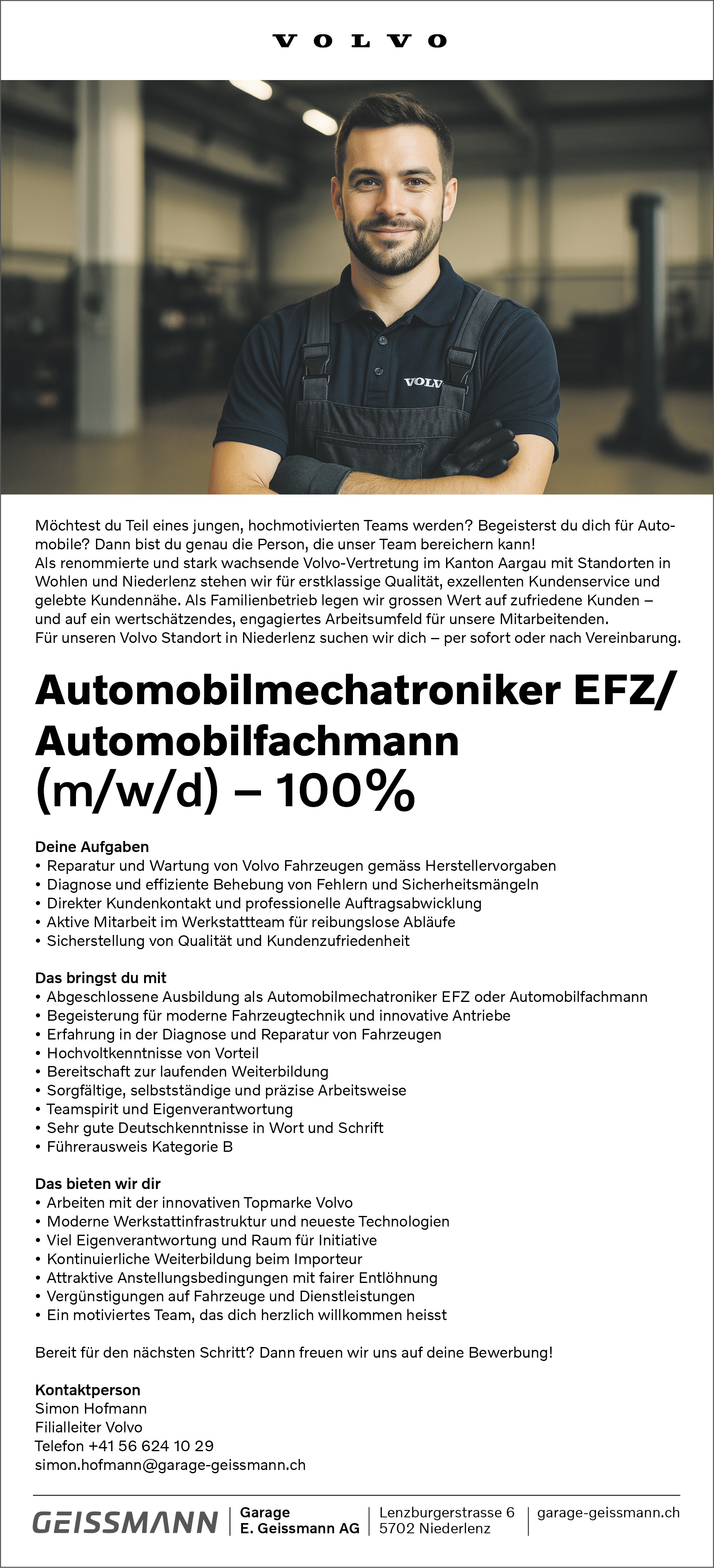 Als etablierte und offizielle Vertretung für Ford und Volvo mit Standorten in Wohlen und Niederlenz stehen wir für Leidenschaft, Kompetenz und echte Kundennähe. Unser Team gibt täglich sein Bestes, um erstklassigen Service für Personenwagen beider Marken sowie Ford Nutzfahrzeuge zu bieten.
